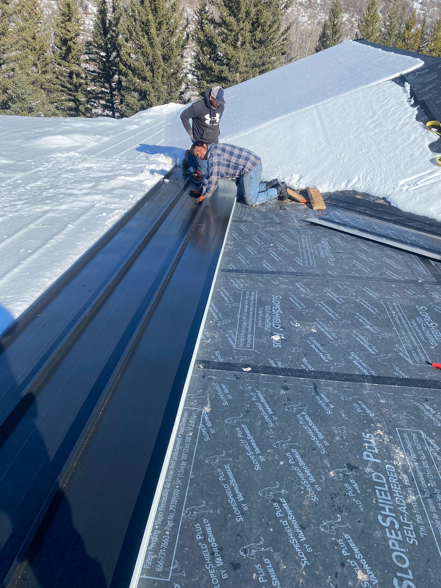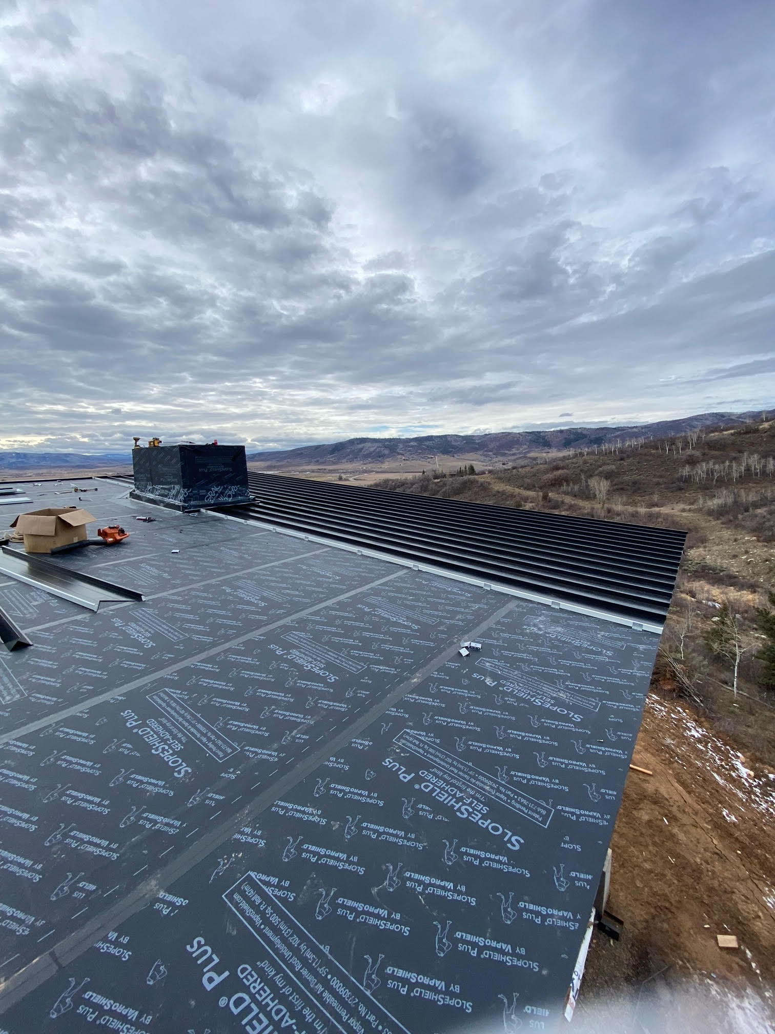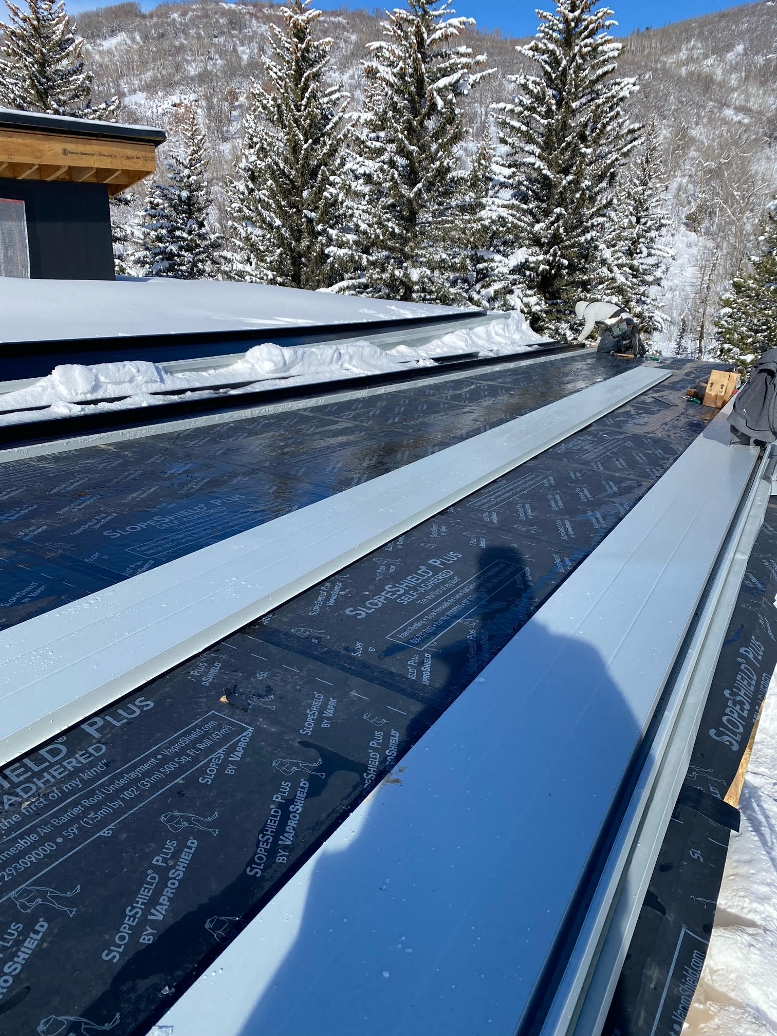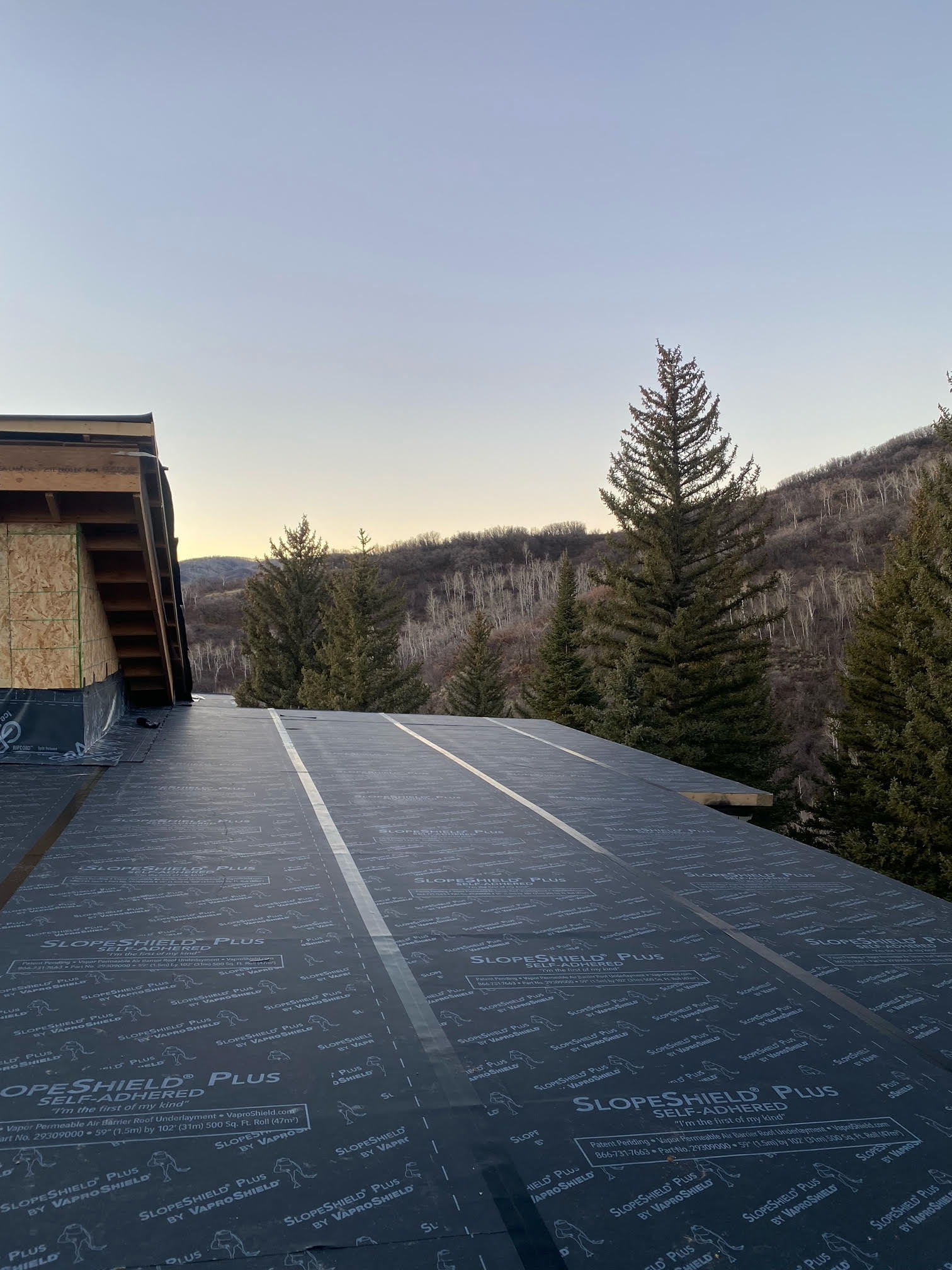 Over 6,000 sq.ft. of SlopeShield Plus SA was applied as the roofing underlayment to the plywood substrate and finished with a durable standing seam metal roof. SlopeShield Plus SA was installed in the harsh winter months and offered 6 months of UV and climate exposure before the final roofing assembly was erected.