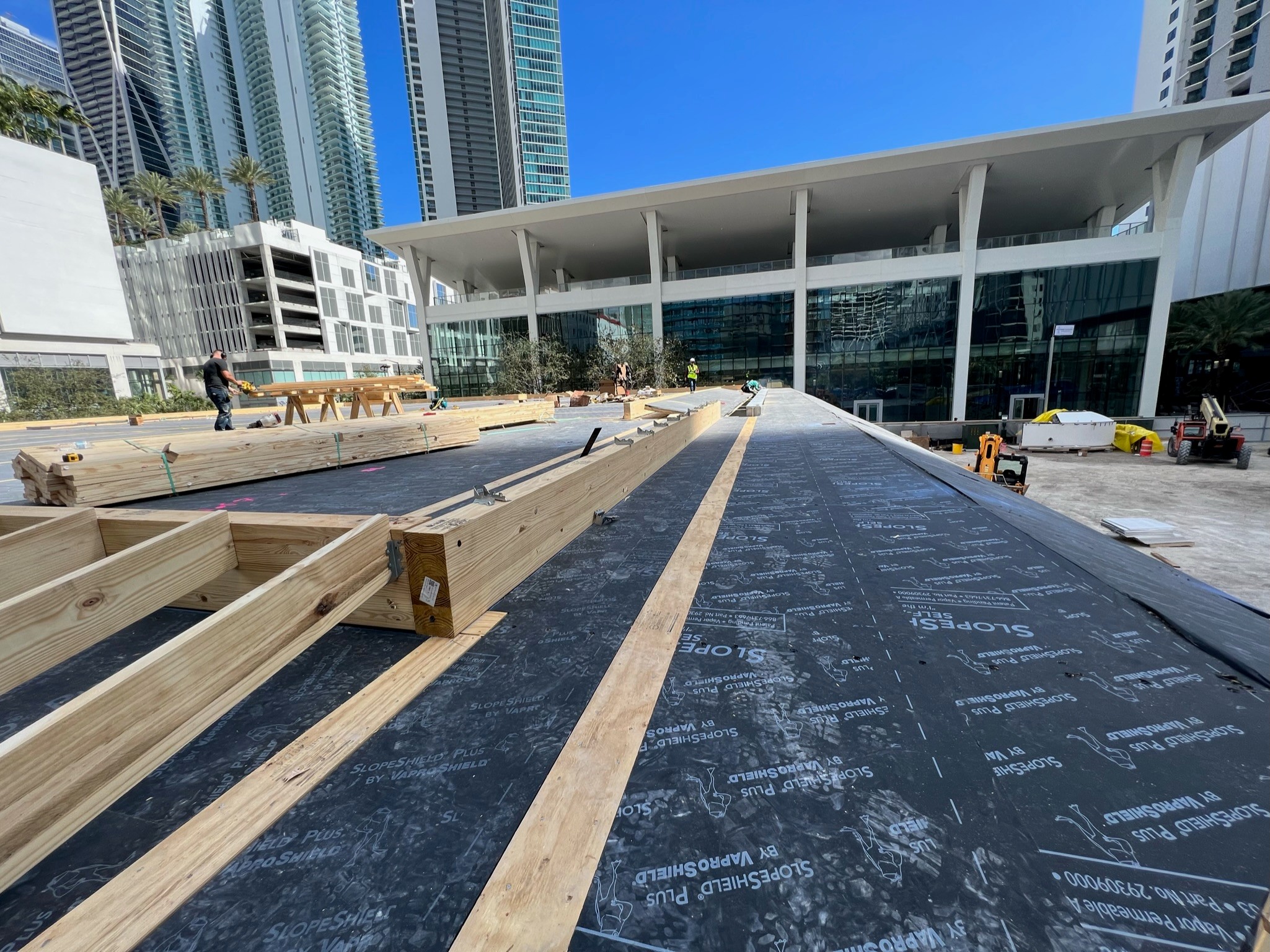 The Retail Store construction project in Miami, FL incorporated mass timber, a sustainable and environmentally friendly material. Over 20,000 sq.ft. of SlopeShield Plus SA, an air barrier vapor permeable membrane, was installed providing exceptional moisture management by blocking bulk water intrusion and concurrently drying mass timber through moisture vapor diffusion. Durable and tough to foot traffic and machinery, SlopeShield Plus SA can be installed on damp surfaces without the use of primer. It monolithically covers mass timber seams and splines and offers six months of UV and climate exposure, making it an ideal choice to meet the demands of todays scheduling challenges.