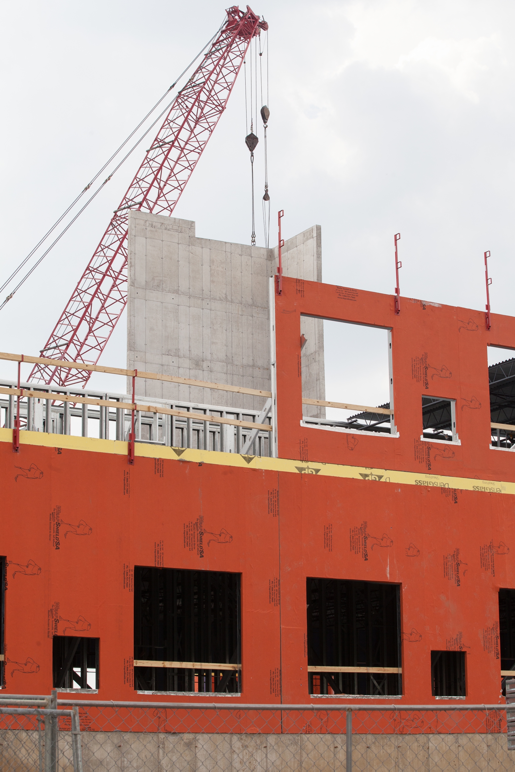 WrapShield SA Self-Adhered WRB/Air Barrier panels (orange) are being installed on the Skyvue Apartments in Lansing, MI.