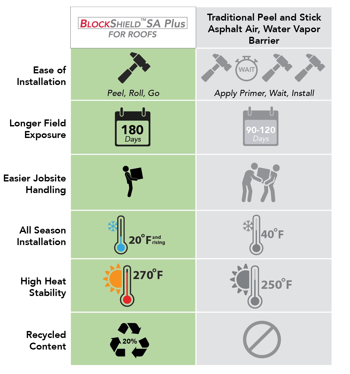 - BlockShield SA Plus benefits compared to traditional peel and stick asphalt:
