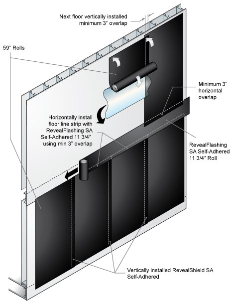 - Vertical seams should be staggered from floor to floor, or separated by a RevealShield SA Self-Adhered horizontally applied strip.